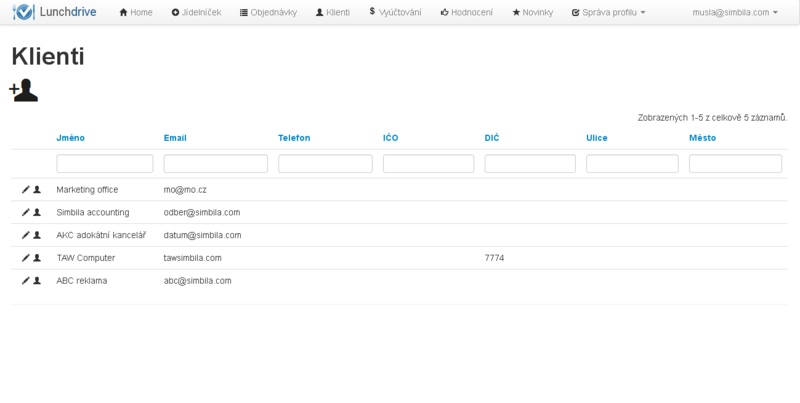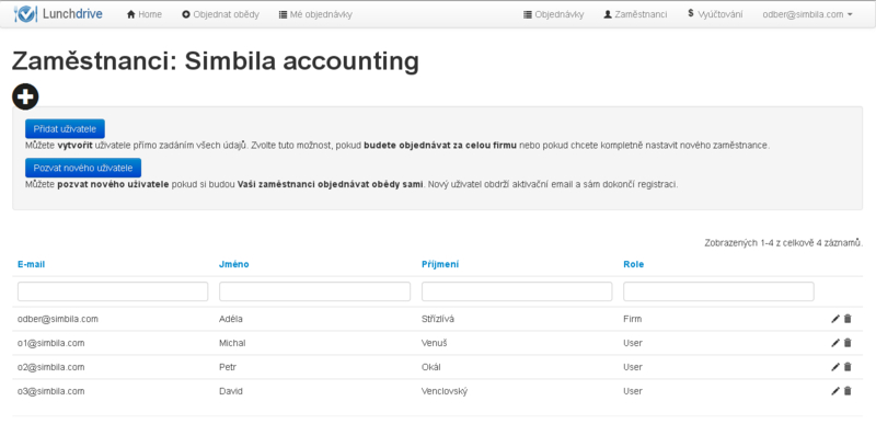 Dodavatel po registraci do aplikace pozve své klienty - firmy, do kterých rozváží obědy. Každá firma obsahuje seznam svých uživatelů - strávníků a zaměstnanců firmy. Tito uživatelé mají do Lunchdrive svůj přístup a mohou si tak sami objednávat své obědy. Jeden (případně více) uživatel firmy je zároveň správcem firemního účtu a může objednávat obědy za všechny uživatele. Objednávky za uživatele pak může provádět i sám dodavatel pro případ, že firma Lunchdrive nepoužívá, připadně pro telefonického objednání. Seznam uživatelů ve firmě může vytvořit Dodavatel i správce firemního účtu.